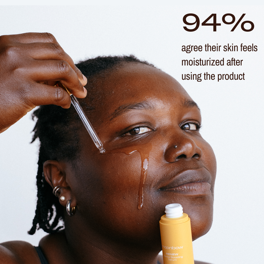 Follow with Renew Barrier Boosting Serum. Appy 1-2 drops to clean skin, massage in & let the transformation begin.